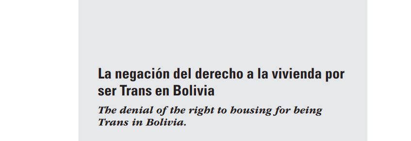 La construcción del Estado Plurinacional de Bolivia abrió las puertas para el reconocimiento de la igualdad basada en la diferencia, reconociendo identidades sometidas por las relaciones coloniales de poder, como, por ejemplo, las personas trans. Esta nueva lógica de Estado propone como fi n supremo el vivir bien para todas las personas, asegurando sus derechos económicos, sociales, culturales y ambientales, particularmente el derecho a la vivienda. Sin embargo, a pesar de esta nueva concepción, las personas trans siguen siendo sometidas dentro de un sistema de violencia estructural, sin vivienda y expulsadas de los programas de vivienda de interés social.